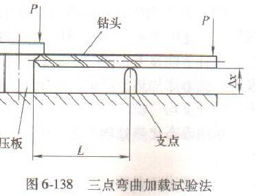 綜上所述,上述過熱區分法均不適于生產應用。經生產試驗和實踐應用,推出一種新式檢驗區分高速鋼鉆頭過熱區分法——彈性變形區分法。彈性變形區分法,即對處理后的鉆頭進行三點彎曲加載荷試驗,使其發生彈性變形,根據鉆頭彈性變形量大小區分其是否過熱的方法。在載荷作用下,當彈性變形量約達△X/2時出現脆斷者,表明該鉆頭為過熱鉆頭。三點彎曲加載荷試驗法如圖6-138所示。該試驗方法經金相法檢驗,合格鉆頭檢驗合格率達99.5%,過熱鉆頭檢驗合格率達99%。該方法適于生產中批量檢驗,每小時可區分1000 - 1500 支鉆頭。